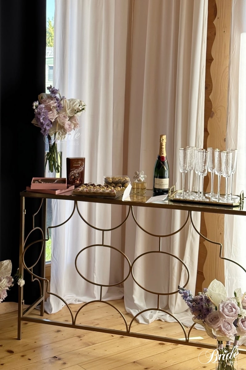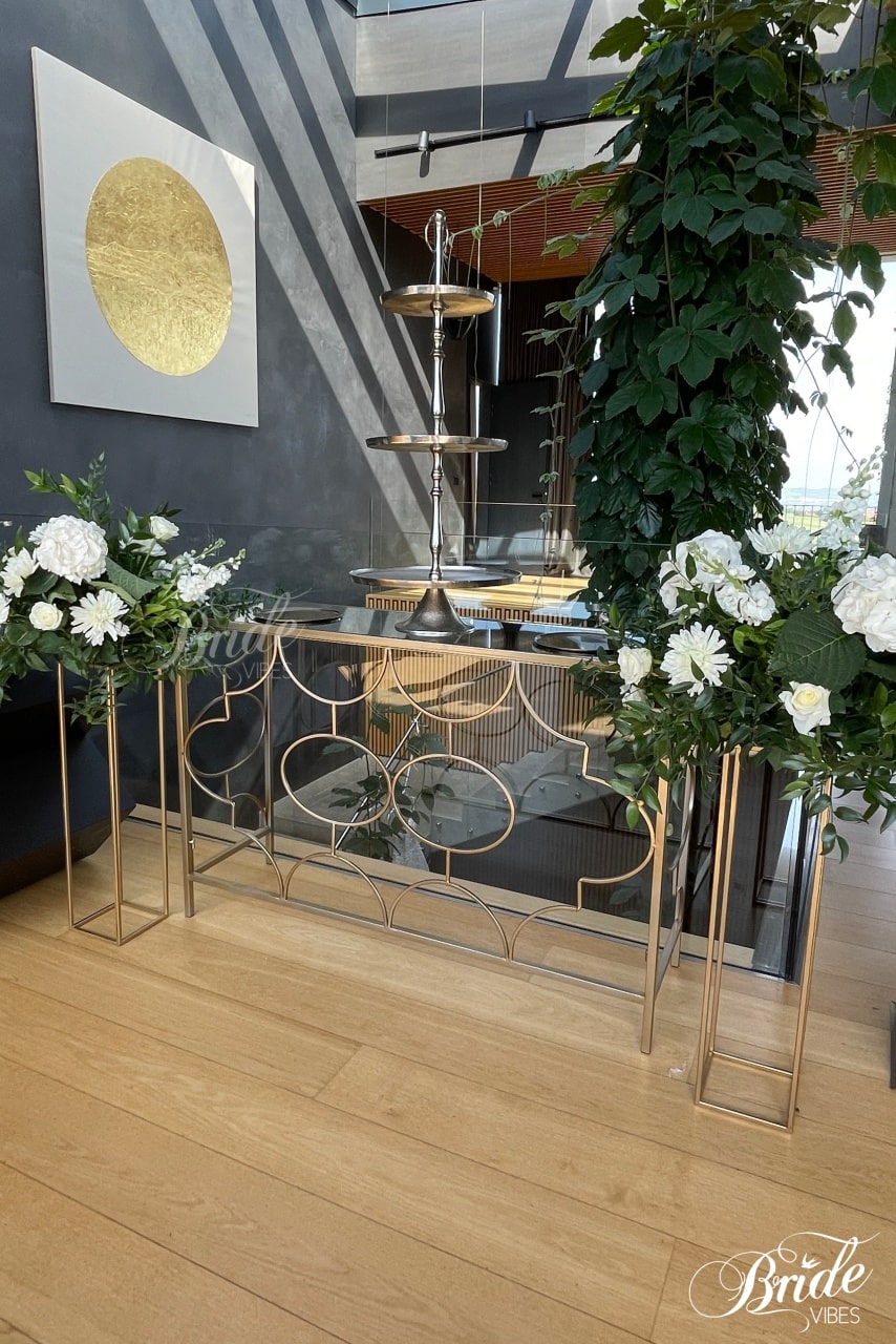 Złota konsola z lustrem idealnie sprawdzi się jako element dekoratorski słodkiego stołu lub w czasie przygotowań Pary Młodej.